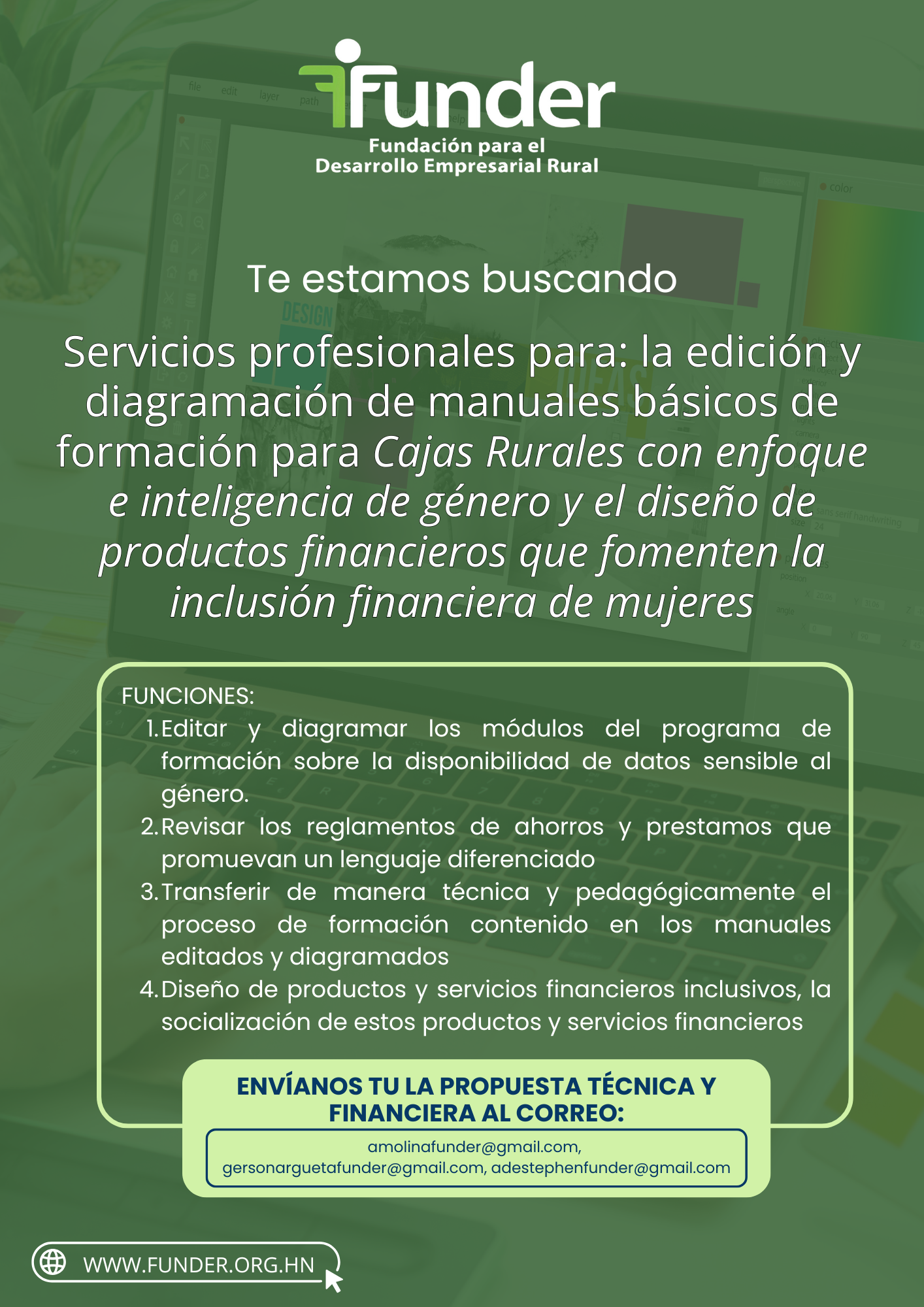SERVICIOS PROFESIONALES PARA LA EDICIÓN Y DIAGRAMACIÓN DE MANUALES BÁSICOS DE FORMACIÓN PARA CAJAS RURALES CON ENFOQUE E INTELIGENCIA DE GÉNERO Y EL DISEÑO DE PRODUCTOS FINANCIEROS QUE FOMENTEN LA INCLUSIÓN FINANCIERA DE MUJERES.